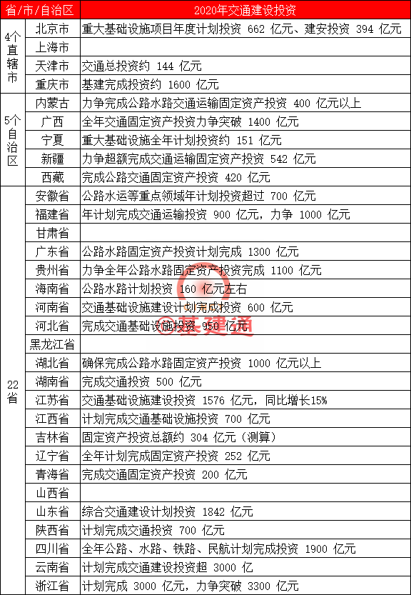而随着全国 31 个省市自治区(不含港澳台)的政府工作报告和交通运输会议的公布及召开,2020 年我国各个地区的交通建设目标也随之明确。