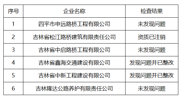 省交通运输厅于2025年9月10日对公路养护作业单位资质情况进行了“双随机、一公开”抽取,共随机抽取了6名检查对象,于2025年11月17日全部检查完毕,现将检查结果予以公告。